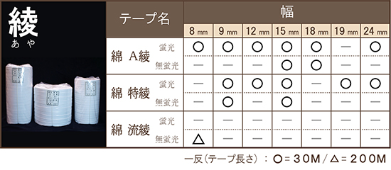 "Aya(twill)" Tape and "Kohaku(simple woven) " Tape which are used as margin , decoration, reinforcement, seam and crest are necessary to dress and its ornaments by all means.