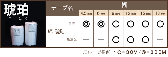 綾・琥珀テープは、縫いしろの始末、飾りテープ、丈夫にしたい袋口や見返し、また前たてなどとして服飾に欠かせない細巾織物です。
